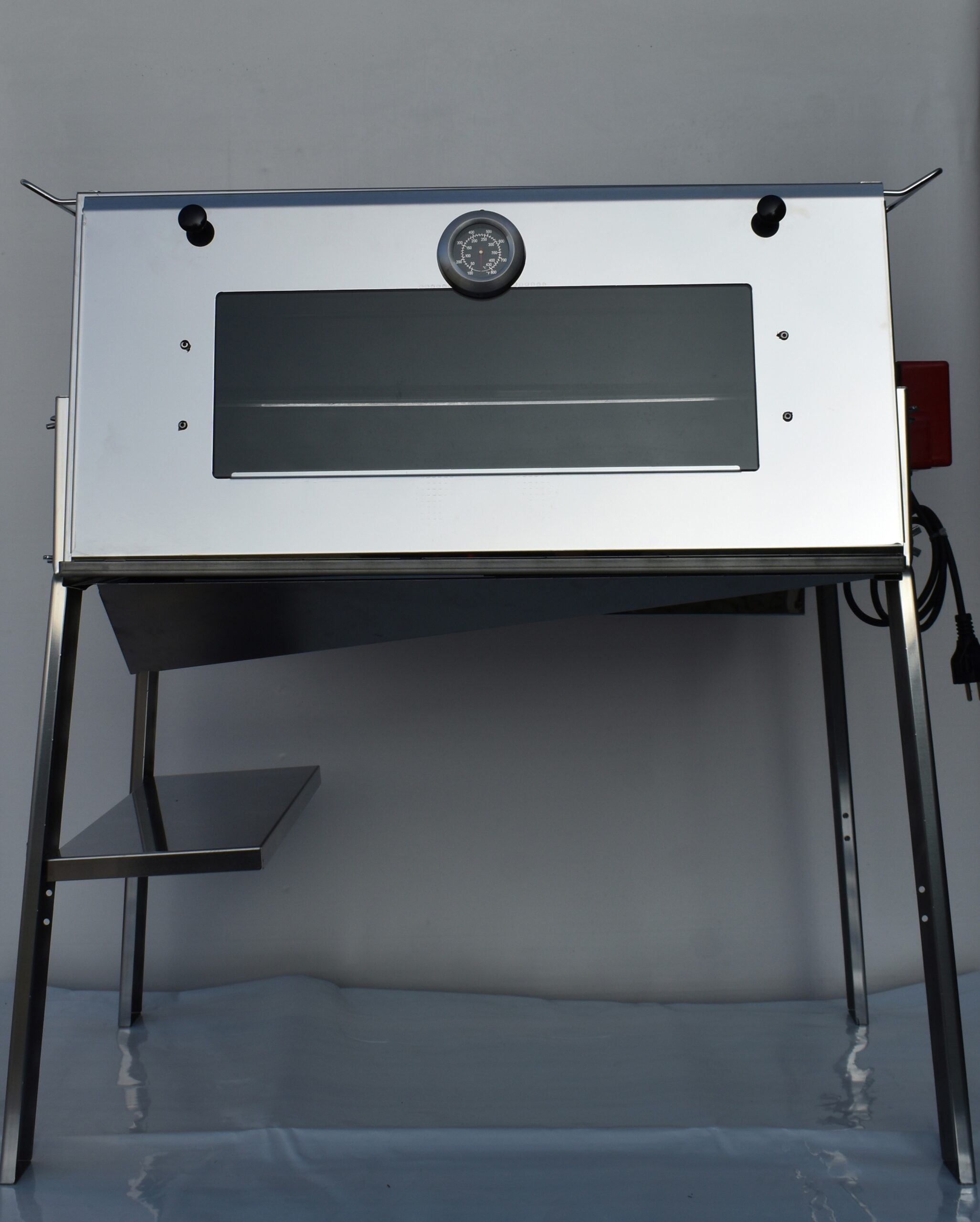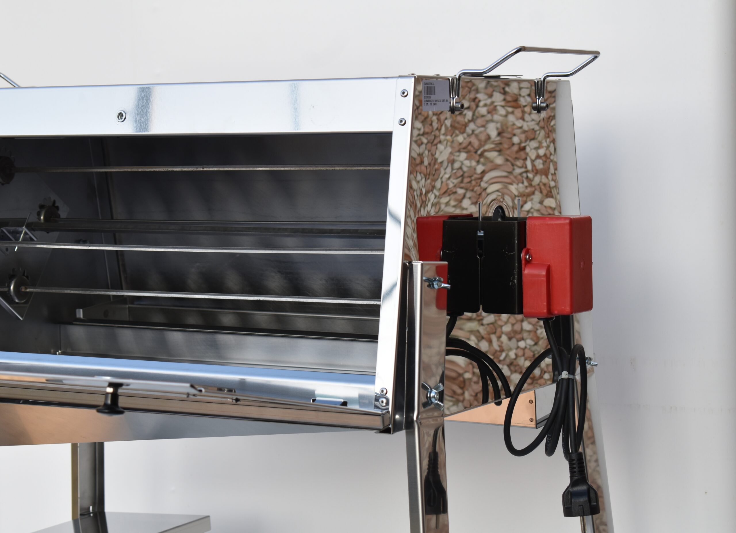 È realizzato in lamiera di acciaio inox AISI 430. È dotato di un braciere laterale e la cottura è prevista con la brace. Consigliamo che la brace venga inserita già rossa per evitare fumo che potrebbe “macchiare” il cibo. Il materiale usato è facile alla pulizia e garantisce un’ottima durata. Il girarrosto è dotato di motore elettrico 220V con 2 giri al minuto, omologato e certificato.